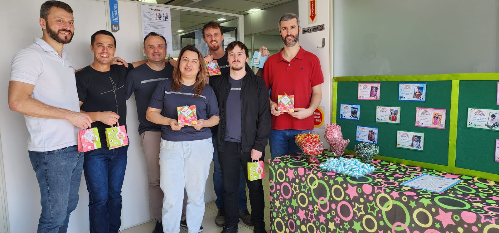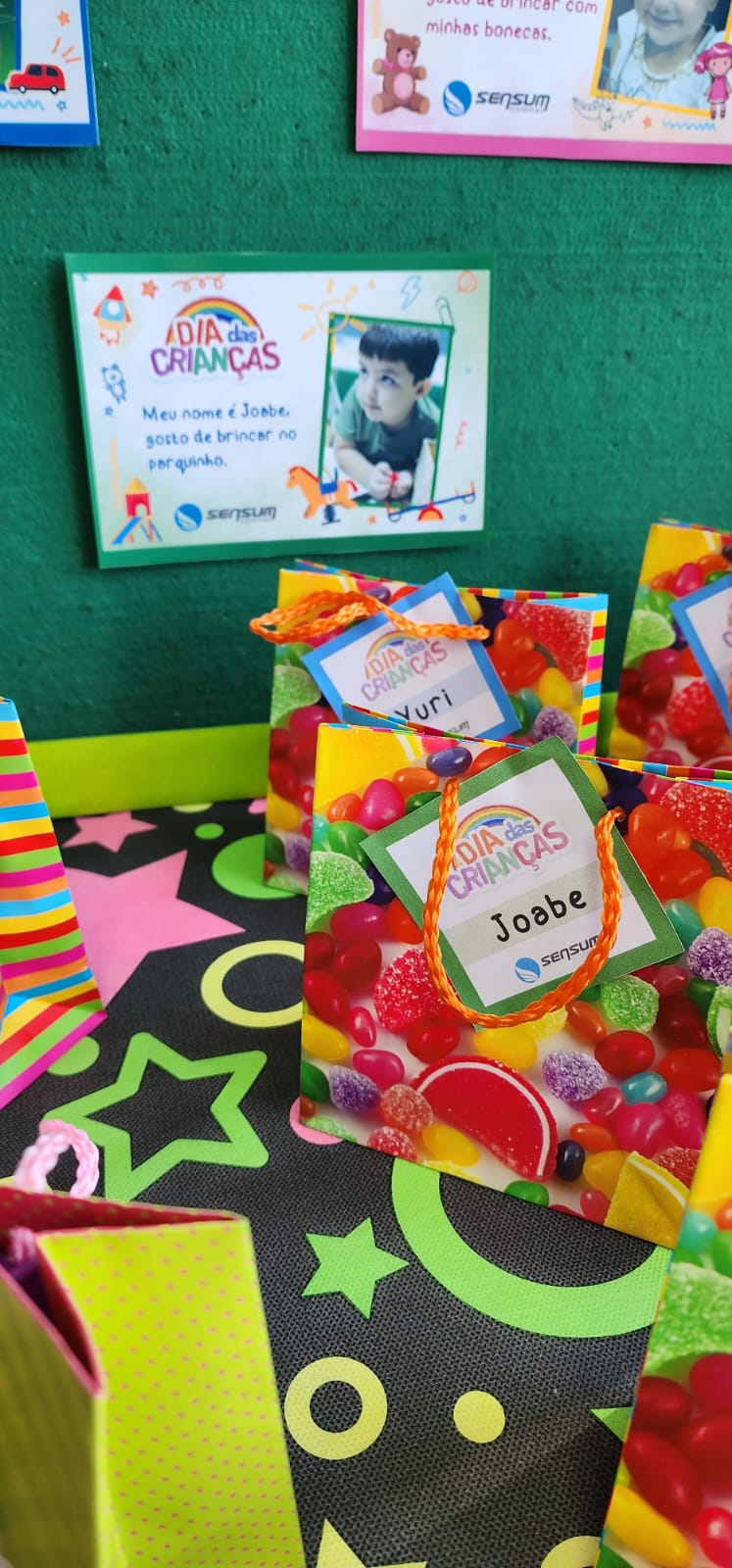 Cartões com fotos dos filhos de cada colaborador foram impressos para uma brincadeira de adivinhação e entrega de brindes para seus filhos.